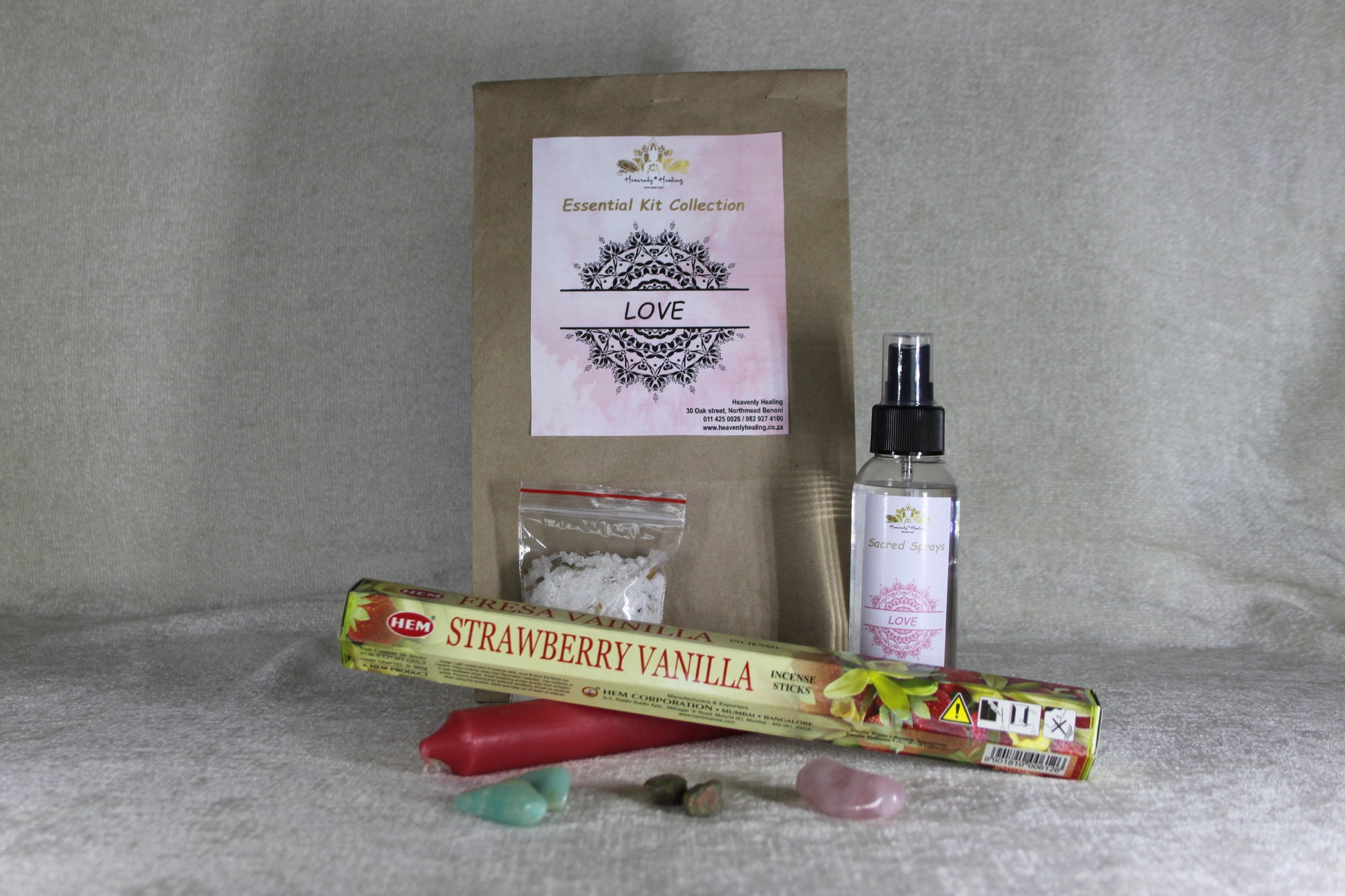 Experience the profound energies of love and self-care with our Love Kit, thoughtfully curated to elevate your spiritual journey. The kit includes fragrant Rose Incense, renowned for promoting love and emotional healing, and Love Spray to enhance loving energy in your space. The Pink Candle symbolizes affection and romance, while the Rose Quartz Crystal encourages self-love and compassion, the Unakite Crystal fosters emotional balance, and Amazonite Crystal aids in open communication. To complete your ritual, our Bath Salts provide a soothing and cleansing experience. Embark on a journey of love, self-discovery, and emotional well-being, surrounded by the harmonious and heart-centered energies of this specially curated Love Kit.