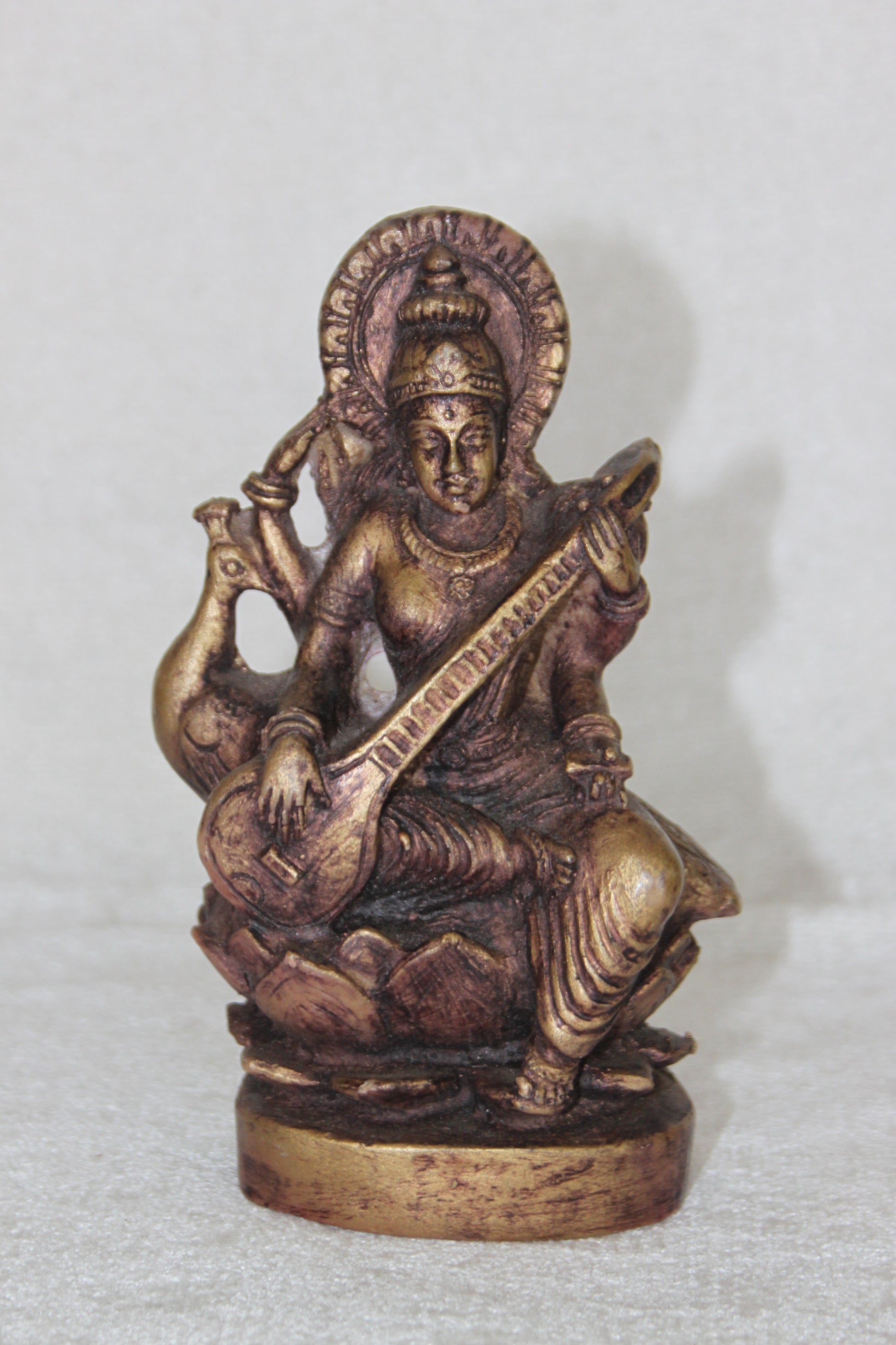 Embrace the wisdom, knowledge, and artistic inspiration of the goddess Saraswati with our Saraswati Statue, a beautifully crafted representation of the Hindu goddess of learning and the arts. With her serene demeanor and the veena instrument she holds, Saraswati symbolizes creativity, music, and the pursuit of knowledge. Her presence radiates a sense of harmony and intellect, inviting an atmosphere of learning and artistic inspiration. Whether placed in your sacred space or home, this statue serves as a visual reminder of the importance of wisdom and the arts in one's life. Saraswati's profound symbolism and graceful design make her a revered figure for those seeking intellectual growth, artistic expression, and spiritual fulfillment.